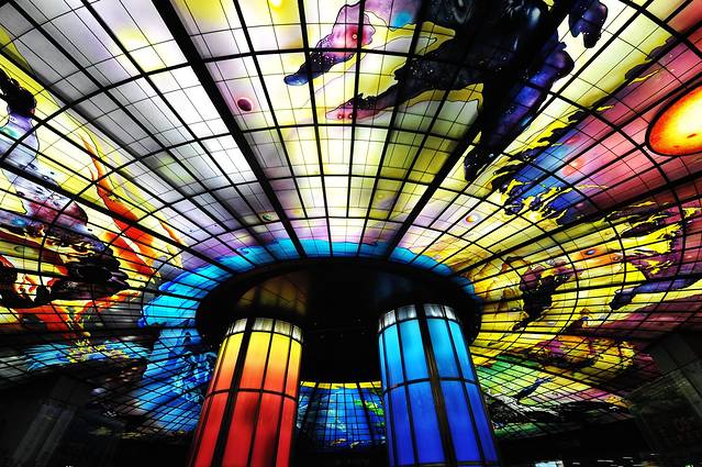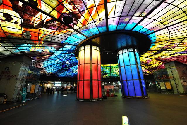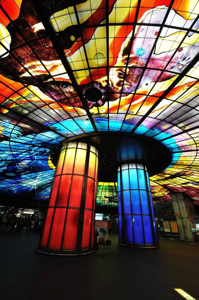 美丽岛站由日本建筑师高松伸所设计,最有名的就是这个五彩斑斓的光之穹顶,意大利艺术家水仙大师(Narcissus Quagliata)亲手打造,实地看来确实震撼。在这个穹顶下面我们还遇到了依然是传说中的“有故事的人”——拉二胡的“台湾新娘”,不得不说,她拉的《那些年》在穹顶之下分外悠扬。