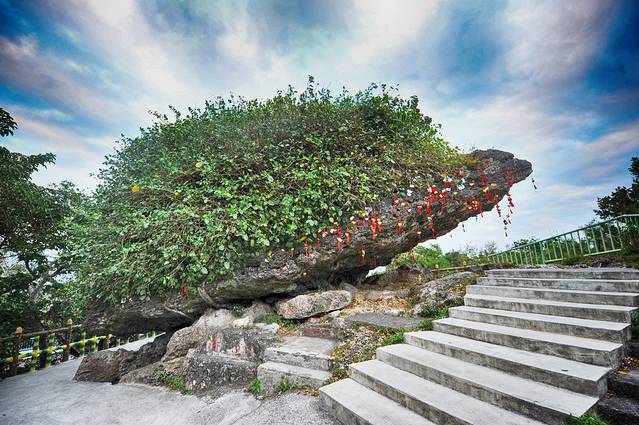 在这里觉得有些意思的是“福灵龟”,其实是一块巨大的极像一只乌龟的巨石,周身都挂满了祈福的红条,看来真的是很灵验。老许兴致勃勃地带我们来参观,还告诉我们要摸着乌龟许愿,然后飞快地跑一圈,跑得越快愿望实现得越快,说完他还先示范了一把,哈哈,这个大叔,还真是童心未泯。嗯嗯,据说“福灵龟”对求婚姻、事业和考试三项最灵哦~!