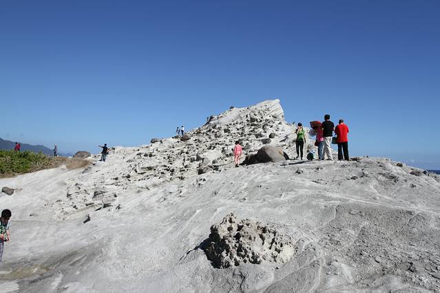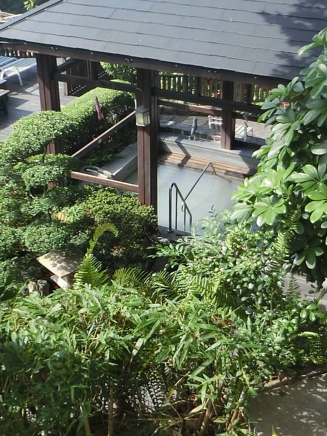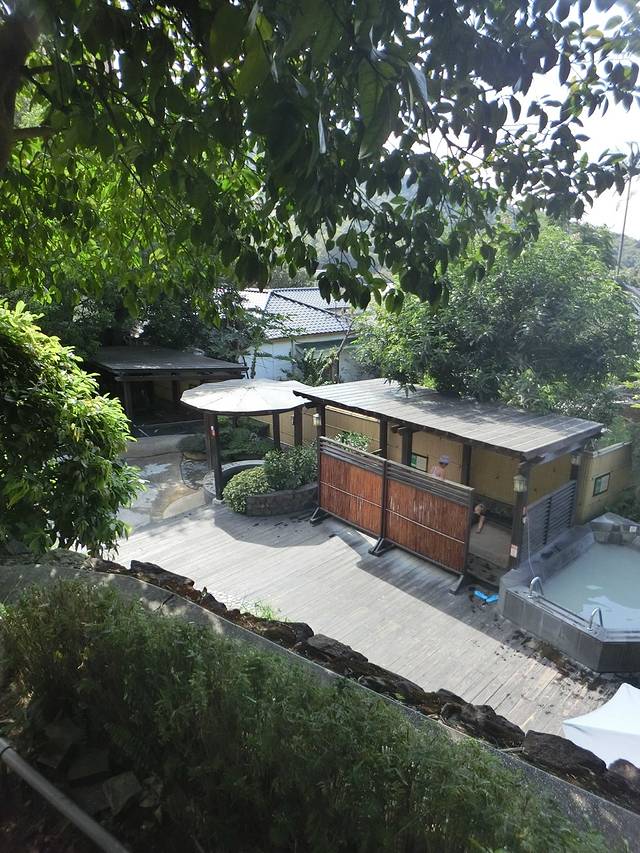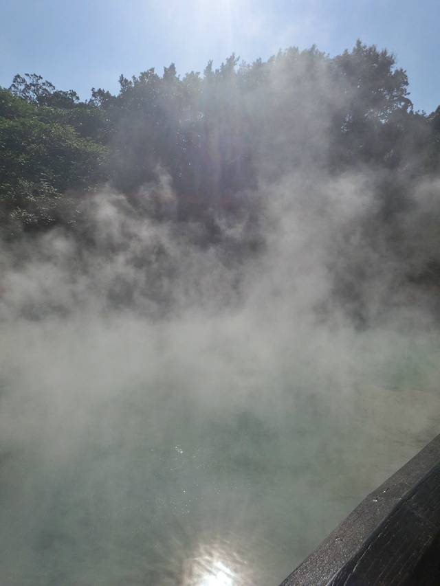 绿色环绕的汤池,颜色则是灰白,硫磺水质