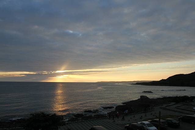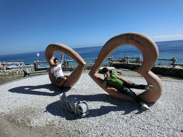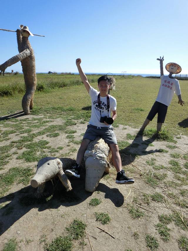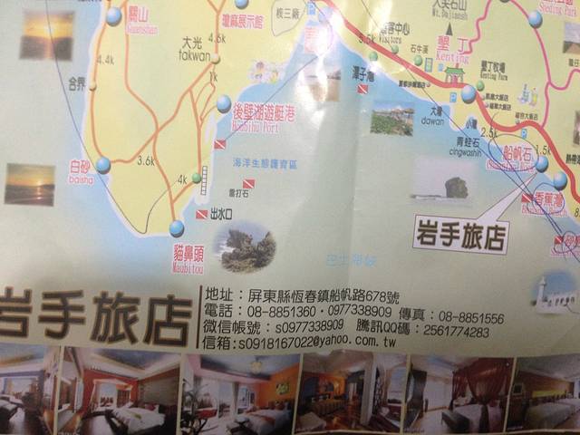 因为花莲至垦丁一般开车也需要6个小时,我们沿途还要游玩,所以彭师傅估计要8个小时,他也要当日返回花莲所以我们预计早上8点就要出发,于是我们7点就起来吃早饭,行李昨晚就已全部整理好。彭师傅准时来接,天气还是照旧好的很,开了大约15分钟后就进入东海岸线,左手边就是太平洋,我们则在靠海的山路上行驶,一路上只要经过风景点,彭师傅都会停车让我们拍照留念,记得有爱心印记、山顶海景、原住民稻草人,巨型岩石山、最美车站多良车站等。大约下午5点我们到了垦丁的民宿,位于船帆石对面的岩手民宿,和彭师傅短暂的告别后他还要赶回花莲,估计要到晚上11点才能到,我们叮嘱他千万要小心驾驶,因为一路过来山路居多,很多弯道,晚上开车比白天要困难很多,谢谢彭师傅。岩手民宿房间都很漂亮,因为我们是从旅游网站预订的,所以房型其实不能挑,但老板娘人很好,第一天先让我们住她留的房间,答应我们第二天就给我们换自己网上看中的房型,她建议以后可以直接找她订房,这样就能选中自己心仪的房型了,岩手联系方式上面酒店信息里有。休整完后我们向老板娘订了明天要用的电动车,800新台币-24小时,可以开一整天不用充电,也有600的,但可能跑的远需要换次电瓶。(因为台湾部承认大陆驾照为国际驾照,所以照道理大陆驾照不能借当地的机车,但垦丁天高皇帝远,管的不是很严,故可以喝当地出租机车的商量下,个人感觉骑机车游玩垦丁效率更高,电动车最高速35m,有些慢,很多时间浪费在路上,有些远的地方没去成)晚上我们坐公交车2站路去了垦丁大街,那里真是美食和小商品的天堂,边走边吃