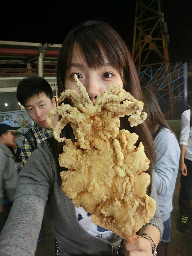 淡水码头油炸大章鱼100台币,多种口味可以选