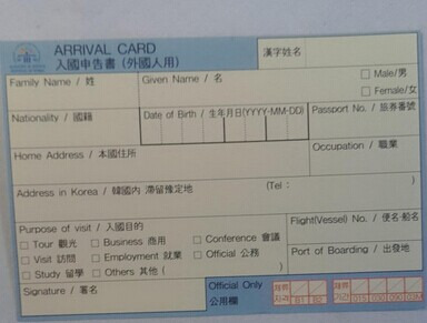 :(从可乐自助游旅行社获得好多有用的信息,超级感谢的,都很有帮助) --- 济州岛是对中国人免签30日入境的,所以你只要带上你的护照,酒店确认单和30日内往返机票就可以出发啦~ 机票: 因为自由行费用的限制,我们定的是上海出发的低价航空公司机票,飞1个小时低价就低价吧,低价就低价吧。咨询的时候,可乐的客服告诉我, 很多客人在上飞机后,收到空姐发的登记单子和申告单子一般都不写,这里要告诉大家,拿到那个单子就填好,不然的话,你下飞机以后就要重新在入境处填写,这样一来时间会浪费很多,而来碰到航班一起到达的时候你就得排队等很久,才能入境哦。这里就放一张图吧。还有一些都是类似的,填写就行了!