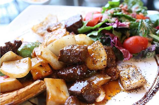 有好酒,当然少不了好“菜”哦。 特色片牛排陪着红酒吃,味道更佳哦。