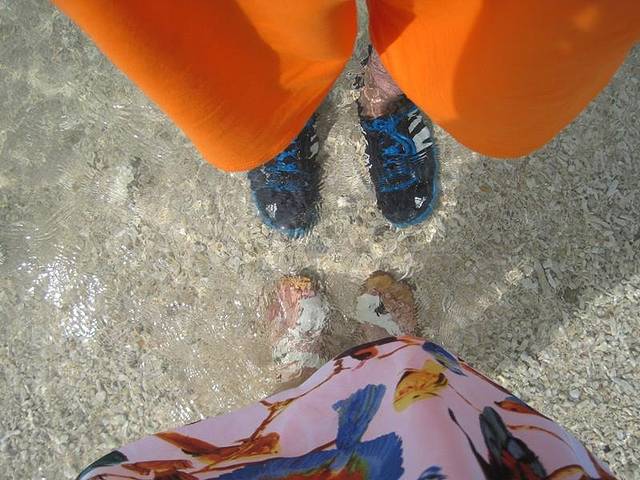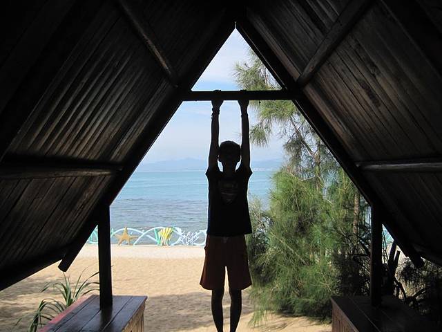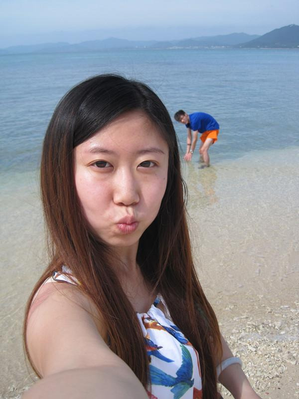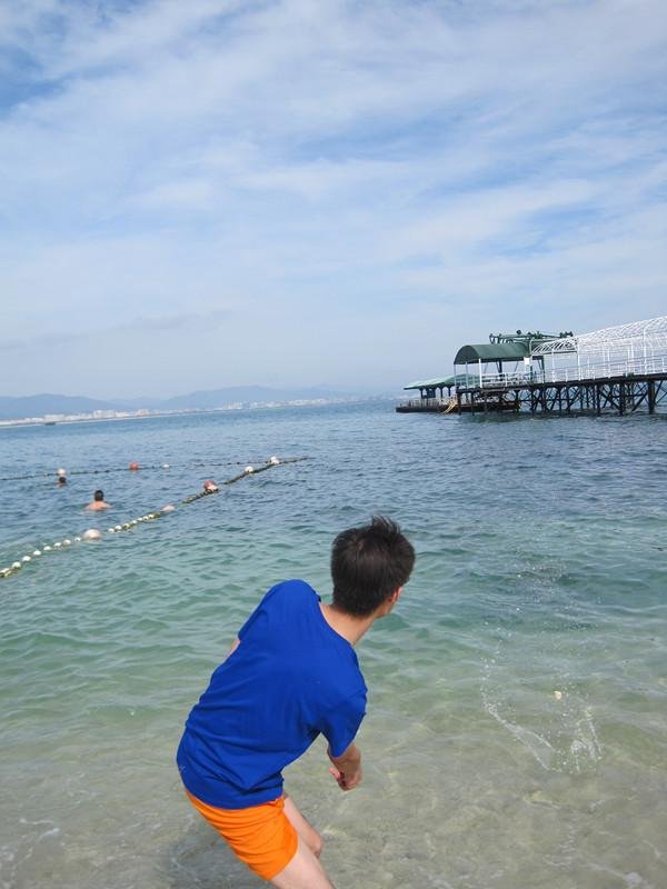 原谅我的没见过世面,刚一下船我就变得异常兴奋,照片上并没有显得我有多么活泼,但是心里已经美的开花了,当然是被这碧海蓝天的美景所感染喽!清凉透彻的海水,白色的沙滩,从下船的马头向看下去,清澈见底的海水中有好多小鱼,好可爱,一看就是那种小海鱼,不像我们北方公园里一个湖里养那么多的大鲤鱼。这么晒的大中午,小鱼们,你们难道不用午休吗?