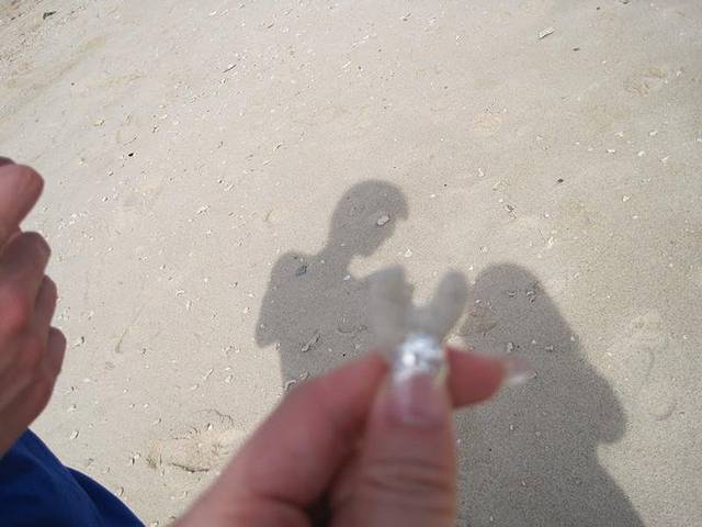 我在沙滩上捡到的“心形”石头(也许是珊瑚)还有我们两个的影子