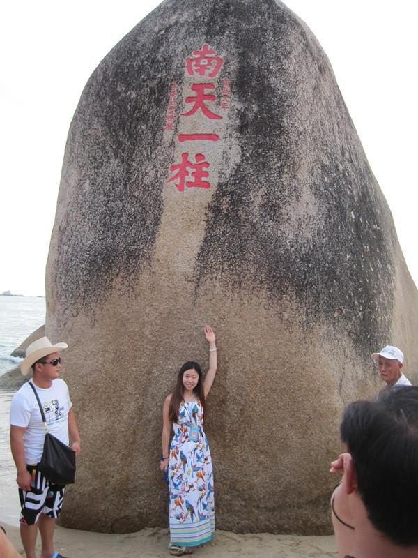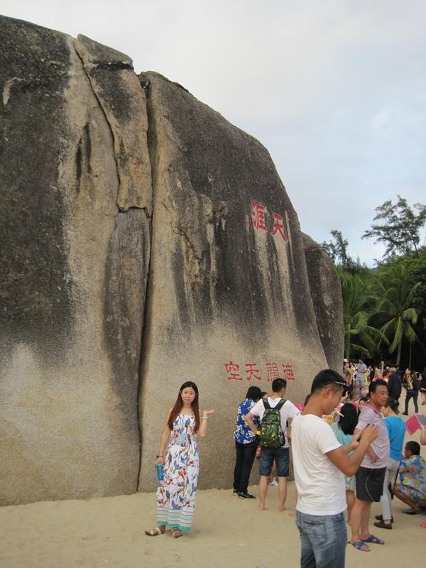 面对大海,朝右手边走去。这时也可以选择做电瓶车,我俩是想一路走一路游就选择了走路,这样不错过任何值得留念的美景,我所意味的美景并不一定非要用相机去记录,因为真的相机的像素是有限的,人的眼睛和人的记忆是无限的,美好的记忆更是让人回味无穷的。一路走来有好多巨石伫立在岸边,好像是护卫的战士在守兵站岗一般挺拔,这些不知名的巨石也是运气不够好,没能被刻上个字,要不然也得有好多人争先恐后的要合影呢。走着走着就会发现人多的地方就是有刻字的石头,果然,南天一柱,海判南天,天涯,海角,尽收眼底,当然说的容易,这几块名气十足的巨石也是相距有一段路程呢,这让我不禁联想起动物世界里的老虎狮子丛林之王都爱撒尿划地盘,哈哈,有些不贴切,却也有点那个意思,这几块名石好像是各自领域的王者,在自己的山头上称王称霸,各路人倒此都会顶礼膜拜,纷纷与之合照。当然我也是个庸脂俗粉,自然是要照相的喽!