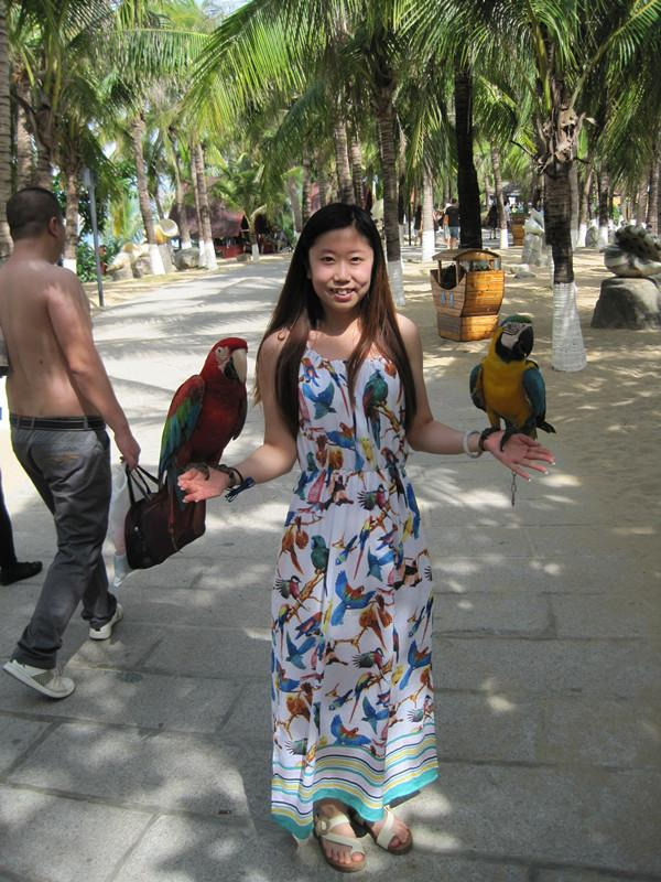 上岛喽!其实西岛是个很小的岛,可以说被开发的地方很小,让我不禁想起一句话,浓缩的都是精华的,这句话同样也适用于我的。登岛后向左边走就沿着海岸线都是沙滩阳光和海水了,也可以在路上走,有一个二楼的观景台,不过我没有上去,一楼呢则是好多买东西的,各种小饰品啊泳衣沙滩衣服烤鱿鱼什么的,就在林间小道旁有好多漂亮的鹦鹉伴照,我兴冲冲地跑过去要照相,结果鹦鹉刚一搭到我手上我就害怕了,别看照片很自然,其实都是稳定了一会后的结果呢!