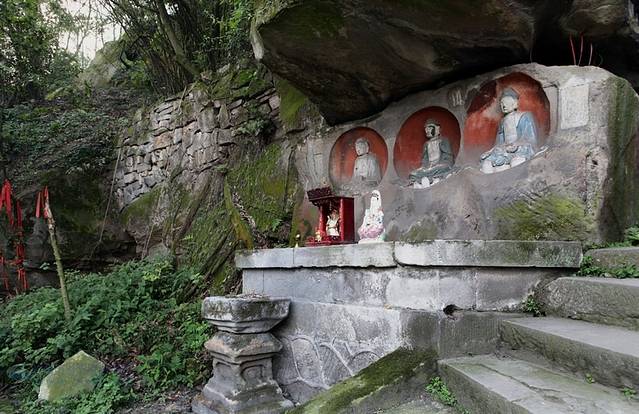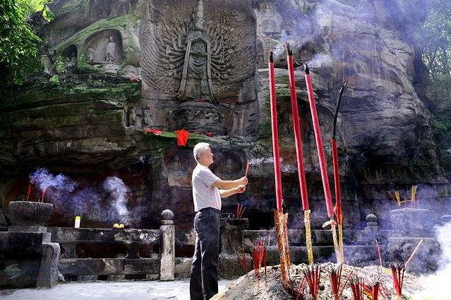 从泸州市区大约开了半个小时才到玉蟾山,我们到了之后首先看到了一尊很大的千手观音神像,在山正门的山壁上,刻得栩栩如生,很神圣庄严的感觉,很多人都在烧香祈福。仔细一看才发现,原来玉蟾山的山壁上几乎都刻满了各种神态各异的神灵,还有山洞里,山脚下,都有好多。