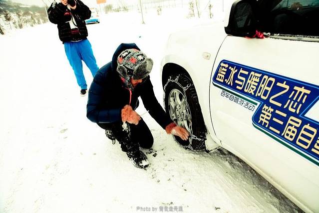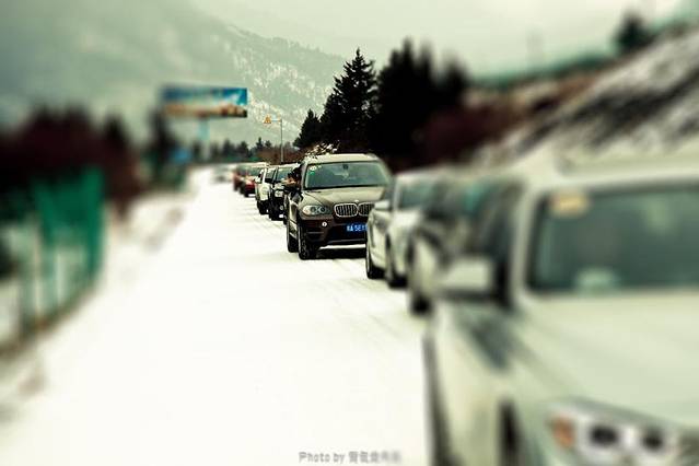 过了川主寺,快到工岗岭的时候,雪下的非常大,室外温度大概-12℃左右,这时候车队都停了,等待技术指导车的指挥,然后大家开始上防滑链!