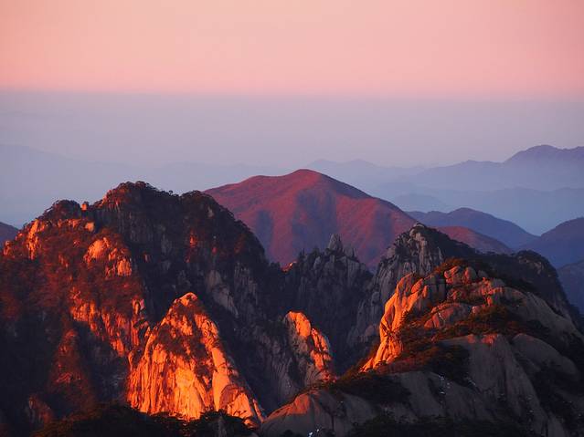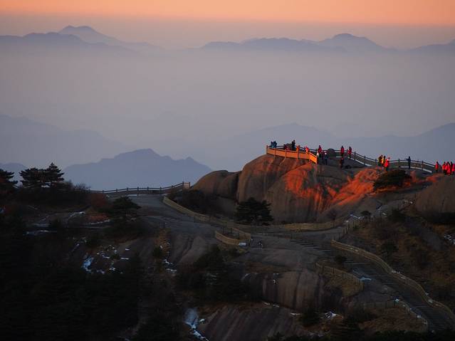 早上7:30到达黄山火车站,出门直走50米,就有屯溪开往黄山景区的班车,20元一位,车程大约1小时。到达景区,换乘景区的车子,有两个方向,我们选择的前山慈光阁,另一个方向是后山云谷寺。我们上山的线路是慈光阁->天都脚下->玉屏楼(迎客松所在地)->百步云梯->一线天->鳌鱼峰->白云宾馆。晚上在宾馆边上的山坡看到了夕阳的尾巴。