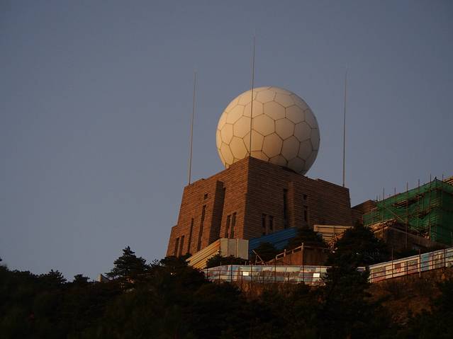 到宾馆放下行李出门听工作人员说太阳已经落山了,在宾馆边上的山坡勉强看黄山夕照的尾戏。这是头顶上的气象台。