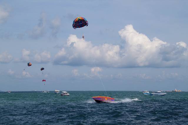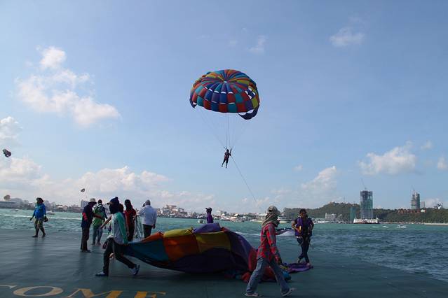 大家乘上快艇,首先来到离海岸几百米处的滑翔伞平台。每人160元人民币,比三亚300多元的便宜不少。展翅高飞,翱翔蓝天。