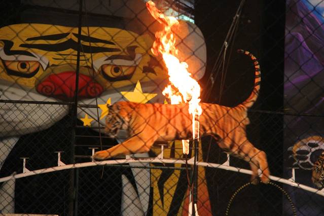 精彩的还要数老虎表演。凡是人能做的,老虎也能做。
