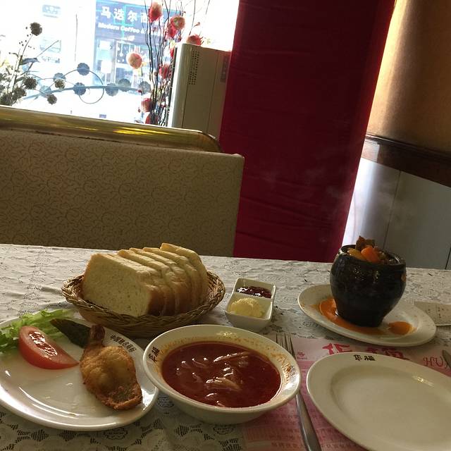 华梅西餐厅:一个人点了一份红菜汤、一套面包(含奶油一份、草梅酱一份)、炸虾、罐焖牛肉,吃到撑。总体感觉挺便宜的,但是菜品吃起来真心不太像西餐,除了使用的餐具。