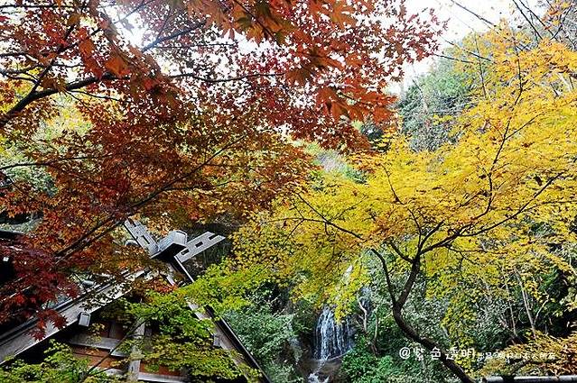 绕过外墙,进入院内,映入眼帘的是一座精巧别致的庙宇,名叫桃李庵。园子里溪水潺潺,顺着水流望去,看到从山涧流淌下来的瀑布。置身在园子里,映衬这渐红的枫树,别有文人墨客,吟诗喝酒的感觉。