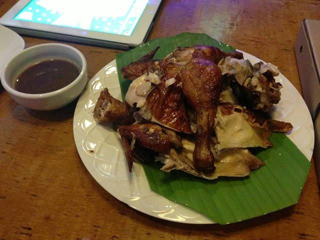 4.在去rejie's meat shop的路上,路边有一个小摊,做烤排骨和烤鸡的,摊子特别不起眼,但是味道特别好。排骨每天只卖4块,必须早定,烤鸡要多一点。排骨250P,烤鸡250P,如果两样一起买,烤鸡会便宜70P。