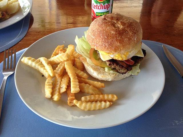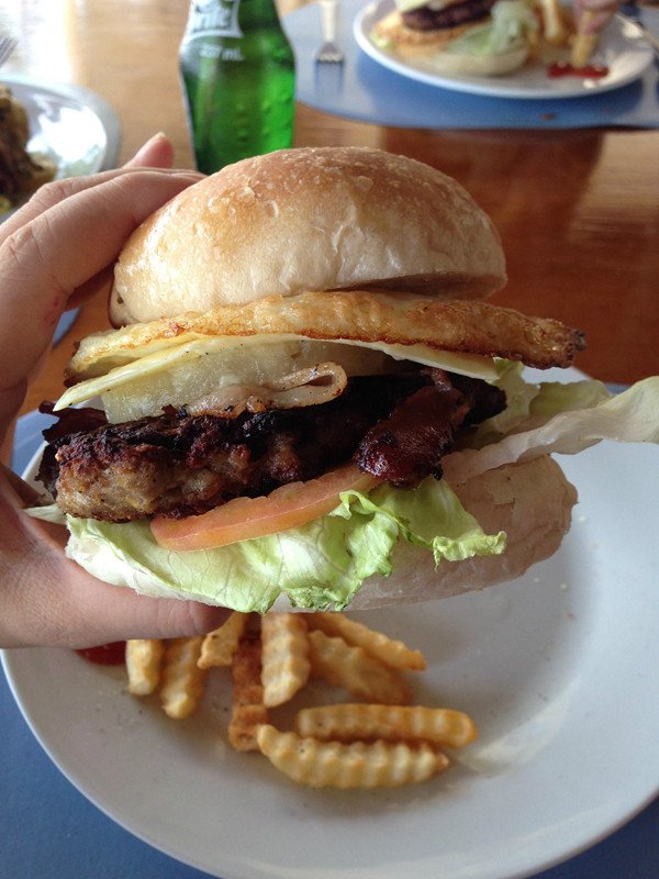 如果你也有机会住这片海滩,一定要尝尝这家LALAGUNA,拉拉古娜的招牌鸡肉和牛肉汉堡。牛肉汉堡250P一份,太好吃了。超大份~~