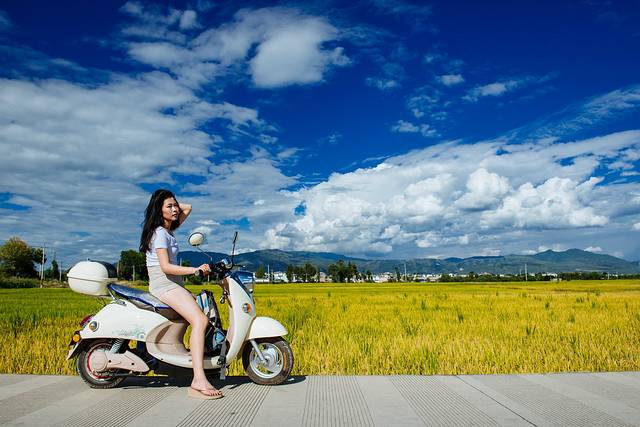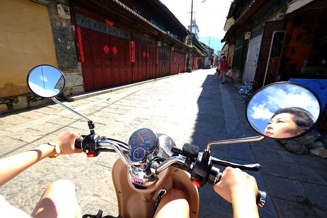 到了双廊我们终于租到了心仪已久的电动车,把小汽车停好换上这电动车,顿时感觉自己变成了双廊的潮人,那叫一个拉风~~双廊镇里到处都有租电动车的小店,一天八十块钱随便骑,貌似最晚可以到晚上十点才还车,电动车的款式挺多,我们最喜欢的还是这种复古款,拍照比较好看