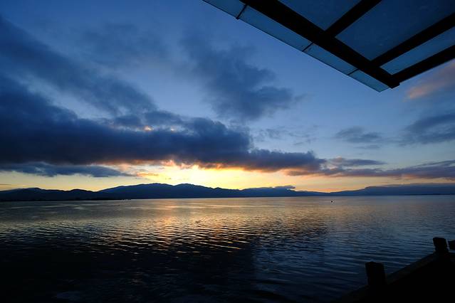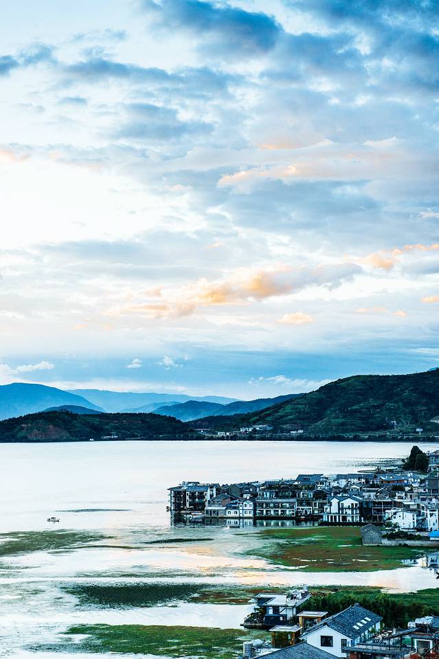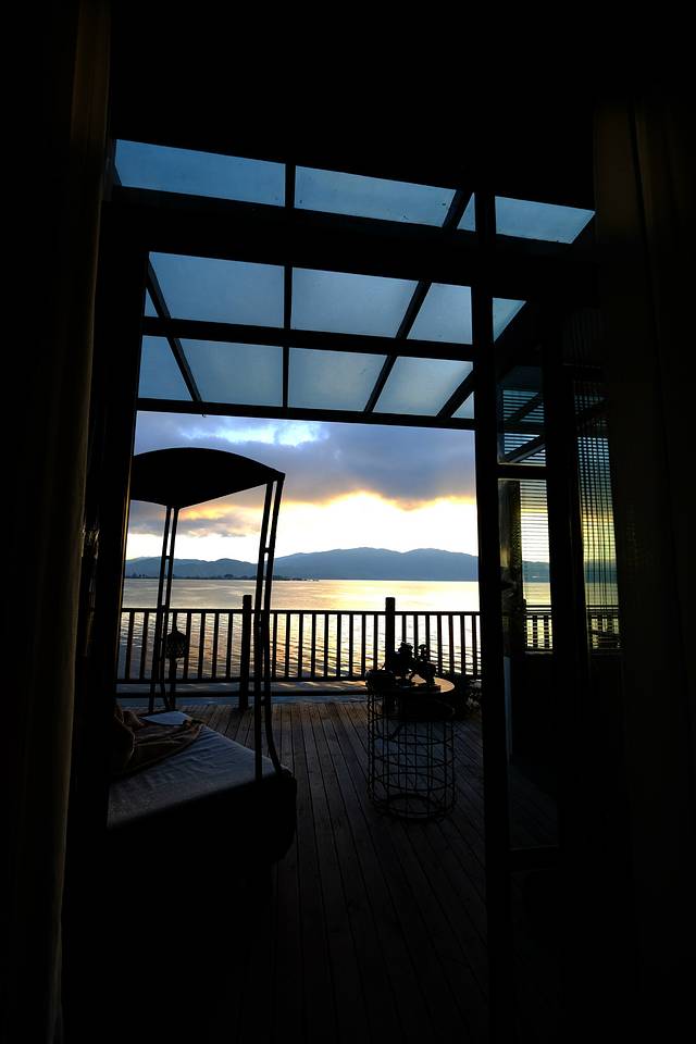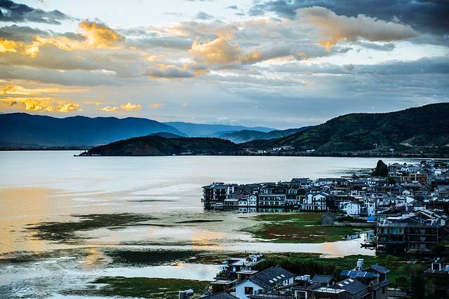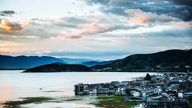 喜洲正好在双廊的对岸,住在喜洲可以看到日出,住在双廊可以看到日落,不过因为两边都有山挡着,所以看不到水上日出或者日落,火烧云也不是很红 编