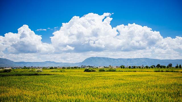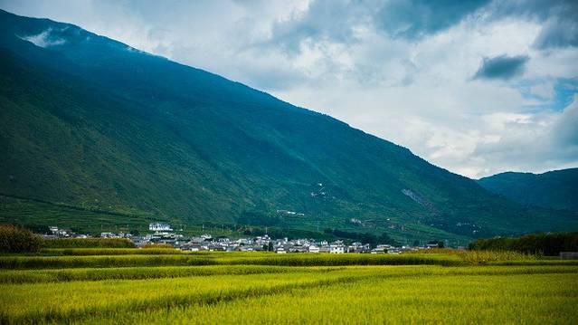 洱海外围一片开阔地之后就是拔地而起连绵不绝的苍山,狭长的洱海从南到北始终有苍山在旁边陪着,山和海之间就是各种村庄和成片的稻田,九月水稻已经开始逐渐变黄,一片片的金色配上村庄里的白房子特别好看。