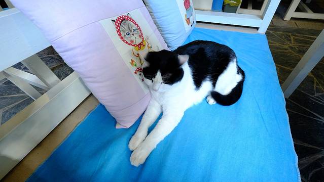 进来看猫不点儿东西不合适,我们这两个不爱喝咖啡的人在咖啡馆里也点不出什么像样儿的东西来,总之味道很一般,价钱还挺贵