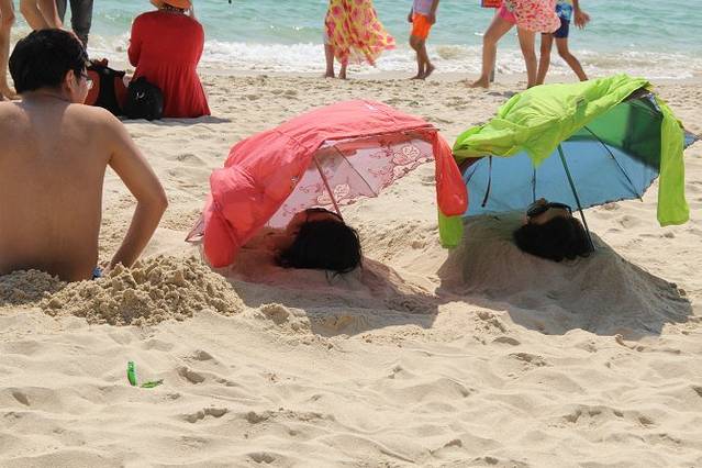 你也可以把自己埋了,就像那俩,享受着日光浴,有没有,特爽。一天下来的肤色直接从亚洲人变成非洲人,火辣辣的,接下的几天是又痛又掉皮,友友们一定要注意防晒。亚龙湾边全是五星酒店,消费较高,所以晚饭就回到大东海解决,就在大东海广场边的海鲜排挡吃的,店家看见我们游客短斤缺两那是相当正常啦,在第一市场和春园海鲜广场那种加工店集中的地带还不用担心被宰,但是在大东海这种比较分散的海鲜排挡,必须带上电子称,还要防止被掉包,不过我有绝招,看下图就明白了。