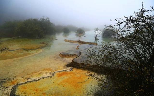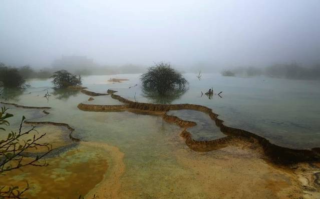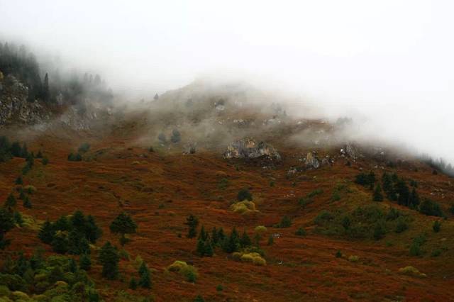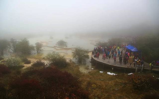 第二天4点准时起床,旅行社用小车接我们到集合地点等大巴,这些都是全国各地散客拼团的,北京,上海,山东。。。老谢负责上车抢位置,到达黄龙2点多了,从川主寺开车到黄龙的那一段山路风景很美,雪山烟雾缭绕,山坡上五彩斑斓的植物,像调色盘,可惜不是自驾游,不然下车拍照景色也十分美。