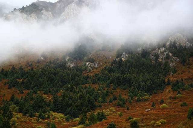 黄龙山上雨雾很大,木栈道很滑磨磨蹭蹭地慢慢走,山顶上基本上没有拍到什么风景,没有想到下山的时候雾气比较少,景色也能看清楚了,但是时间又不够了,所以边拍边小跑,还滑了一跤幸好相机没事。