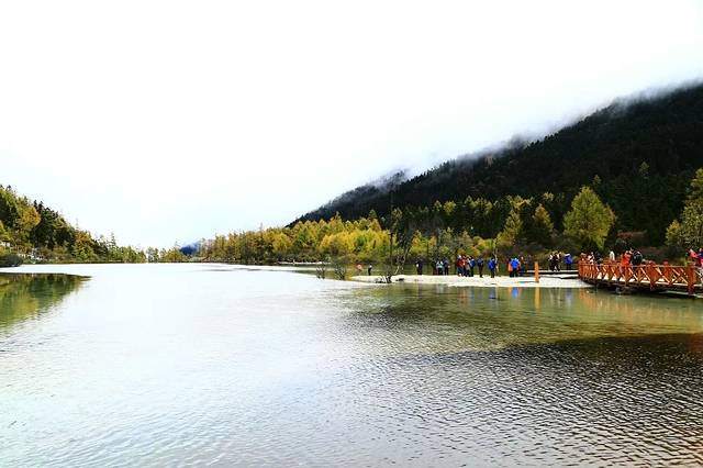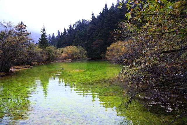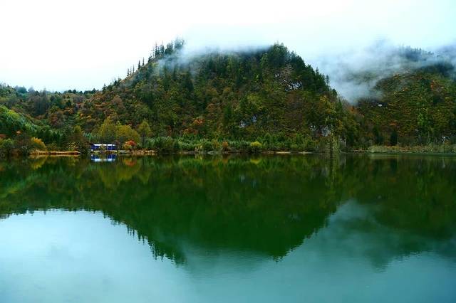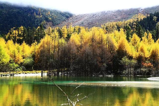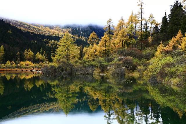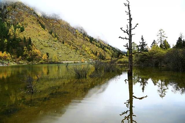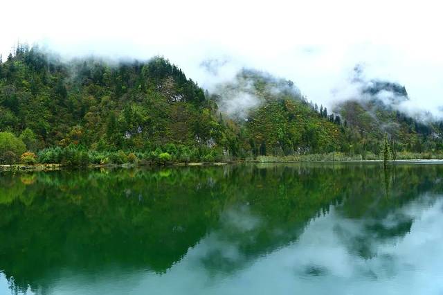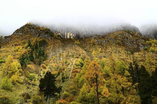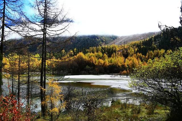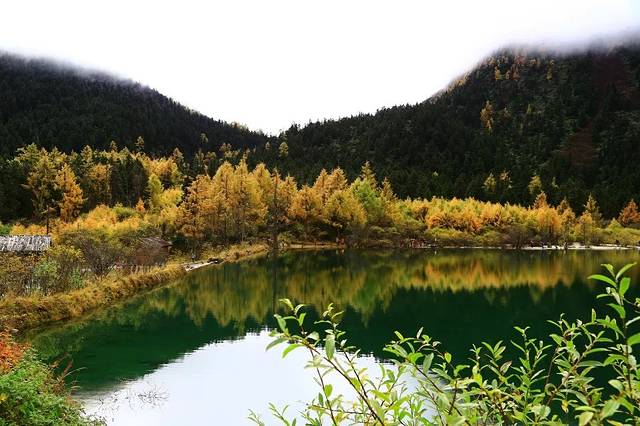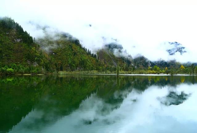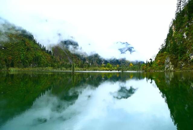 秋换下了毕棚沟夏的绿装,穿上了五彩斑斓黄底的花衣裳。绿成了点缀,红的枫,黄的杉,湛蓝的天空,云雾缭绕分不清是云还是雾。幸运能看到四姑娘雪山的真容,雪山的雪水和泉水如流淌的歌谣悠扬而去,婴儿眼眸般清澈的海子,像镜子倒影着这童话般梦幻的美丽,至身在这水彩画中,此刻我醉了,飘飘然。。。。。。