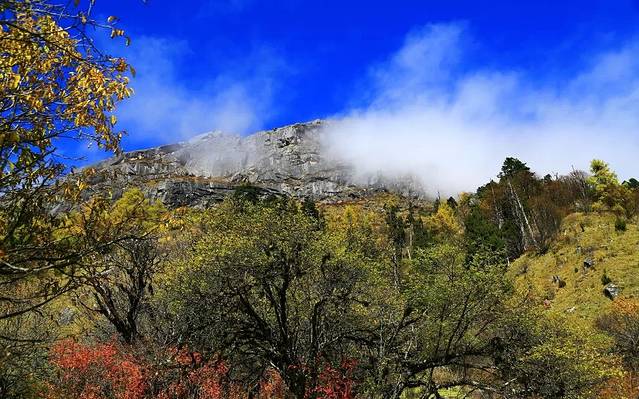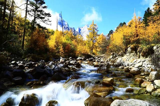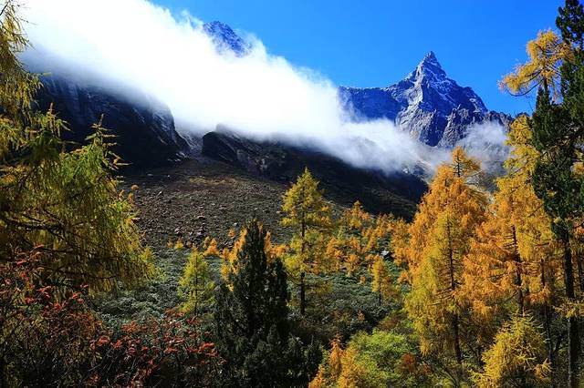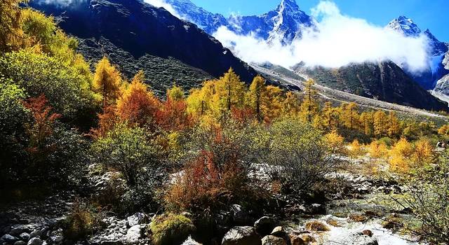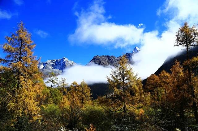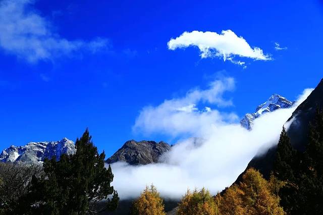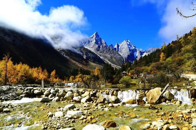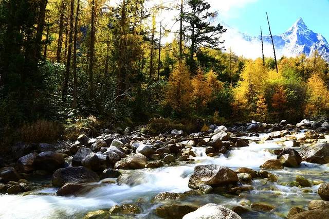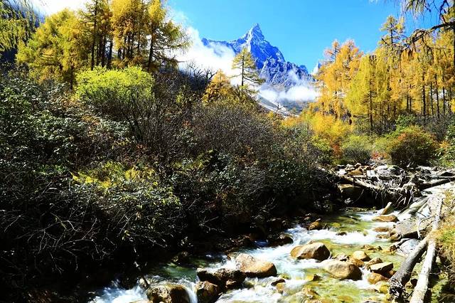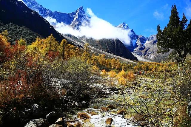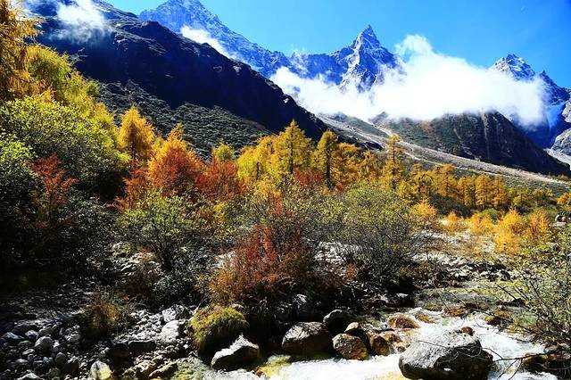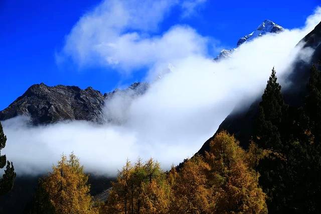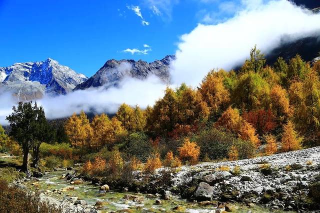 毕棚沟的秋色五彩斑斓,蓝天白云,雪山,溪流,飘渺的云雾
