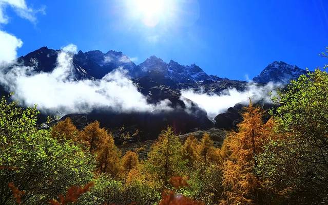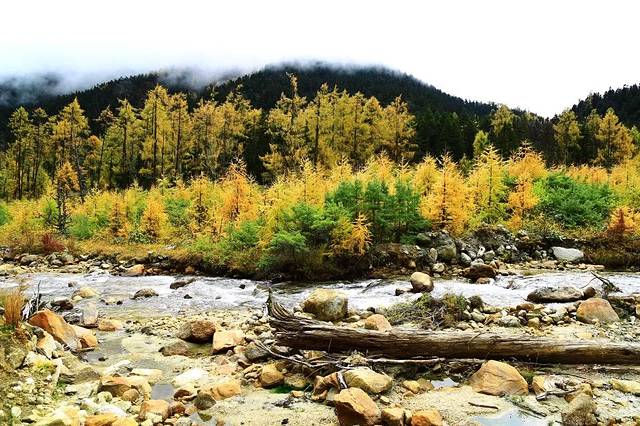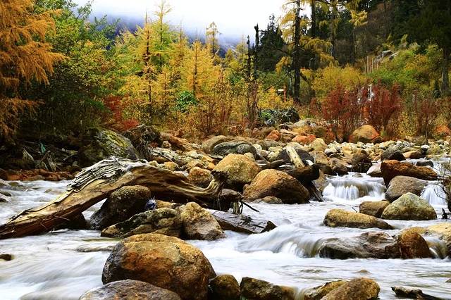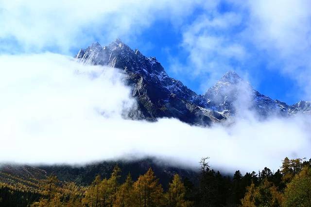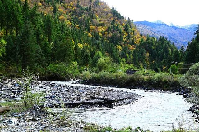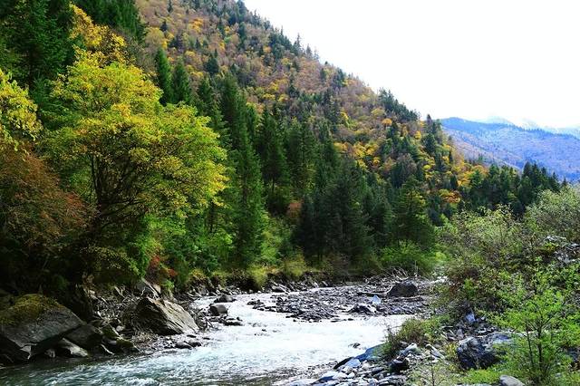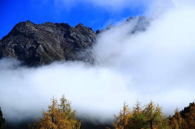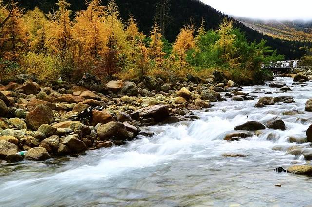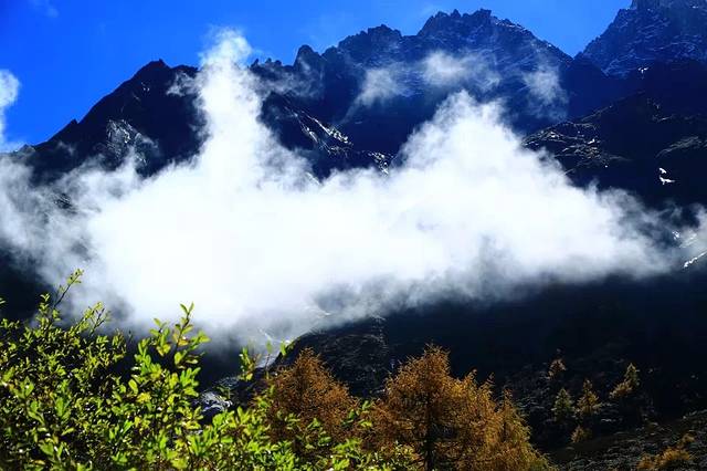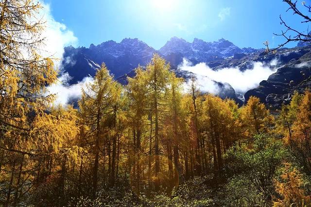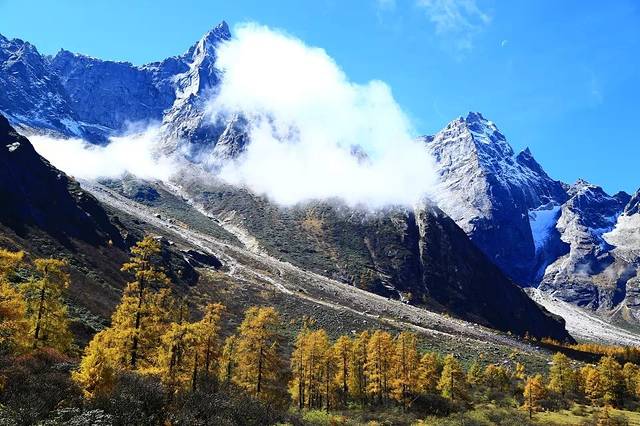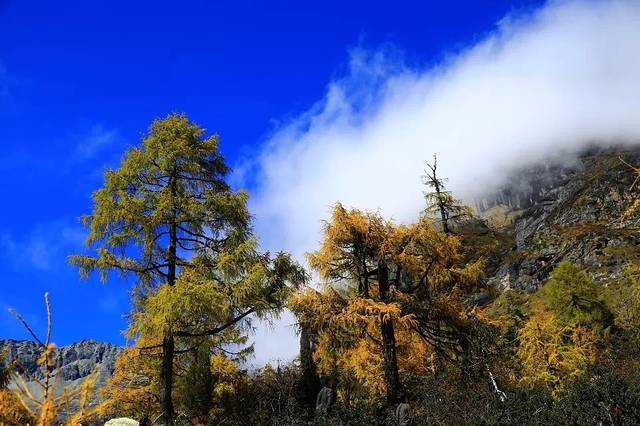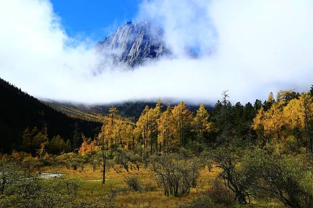 毕棚沟的秋色五彩斑斓,蓝天白云,雪山,溪流,飘渺的云雾