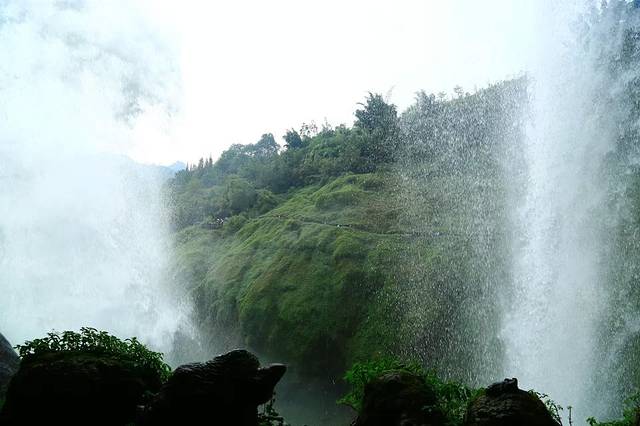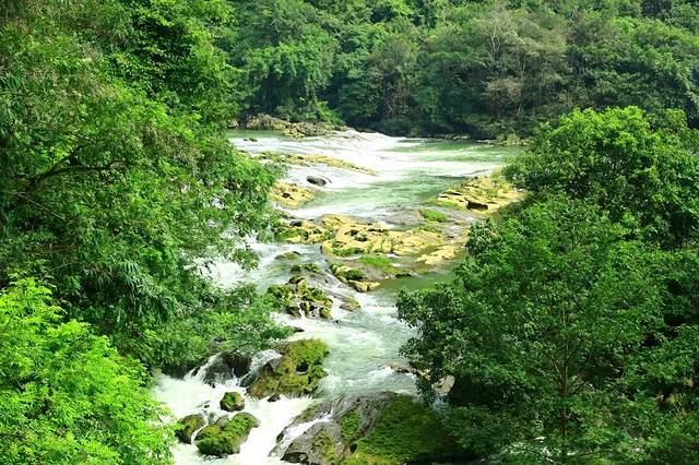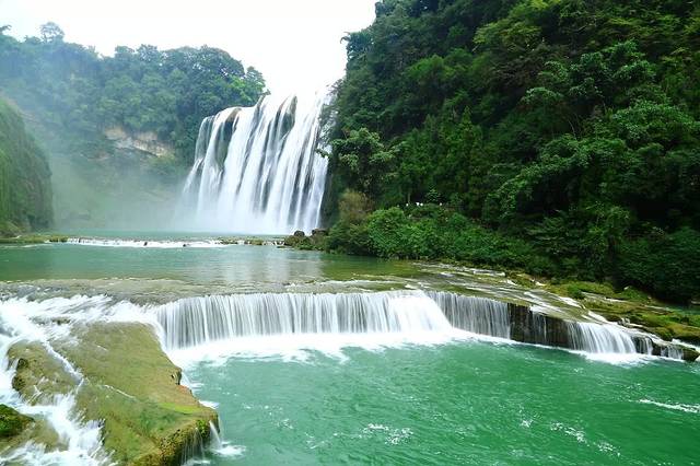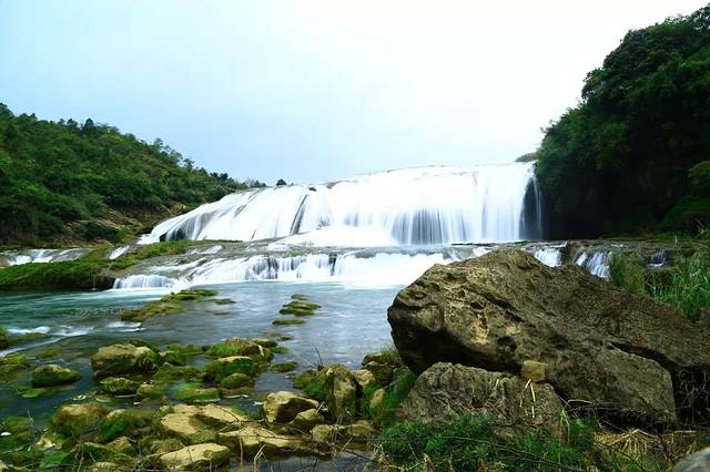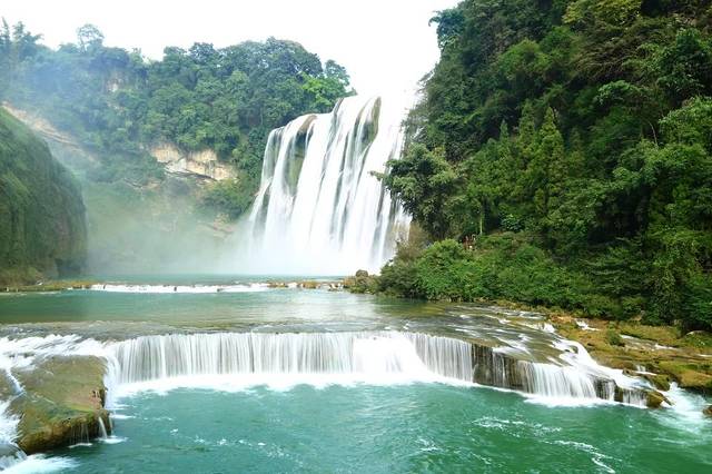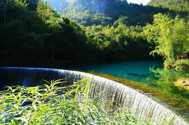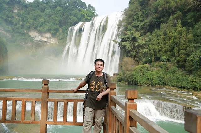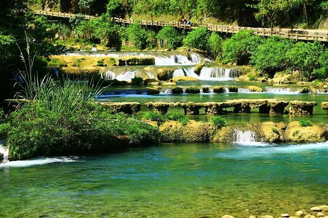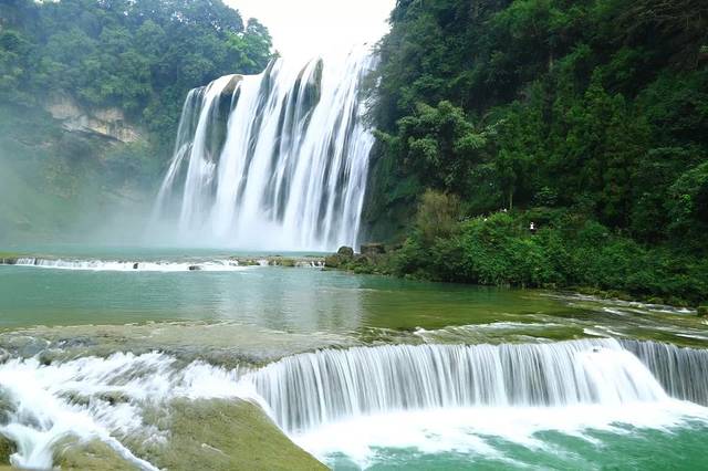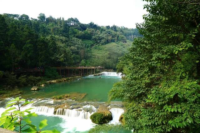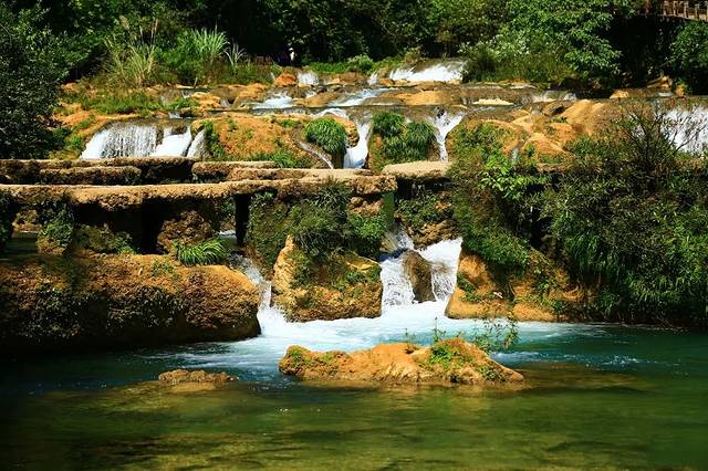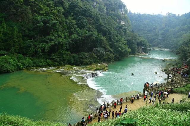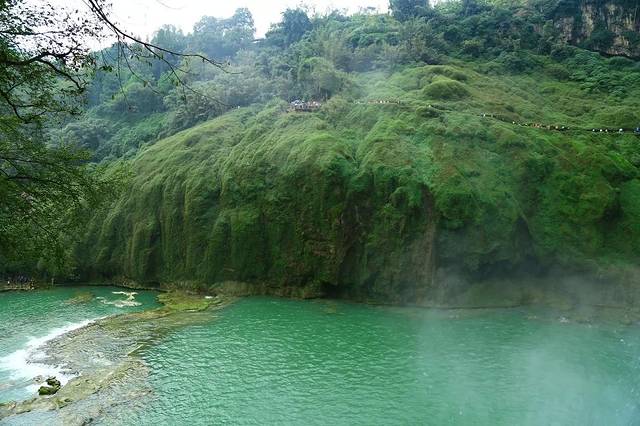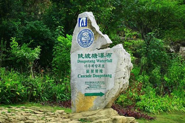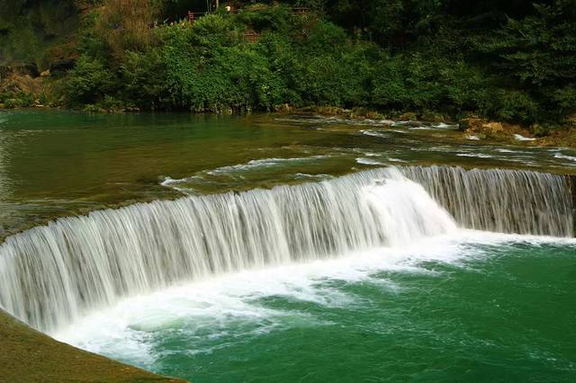 心语他来过两次黄果树瀑布,虽然他有导游证可以免票,但是他已经去过两次了所以在停车场休息,我们先到陡坡塘瀑布景区,这个景区不大,主要景点就是陡坡塘瀑布。陡坡塘瀑布位于黄果树瀑布上游1公里处,瀑顶宽105米,高21米,是黄果树瀑布群中瀑顶最宽的瀑布。陡坡塘瀑布顶上是一个面积达1.5万平方的巨大溶潭,瀑布则是形成在逶迤100多米长的钙化滩坝上。这里基本上半个小时就可以搞定,今天因为是平日所以游客不多,在这里刚好在景区门口碰到广东的旅游团,只能感叹在哪个景区都能碰到广东人,呵呵。