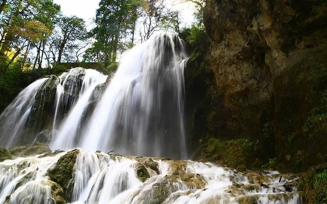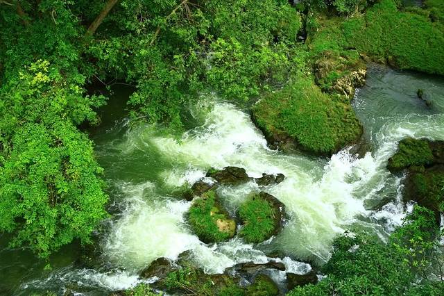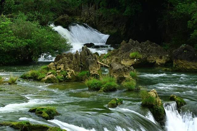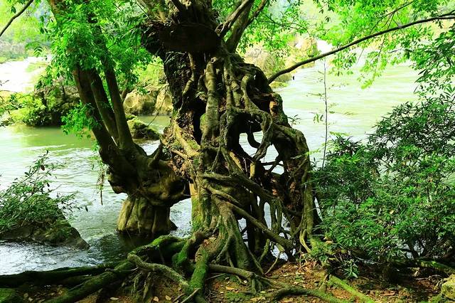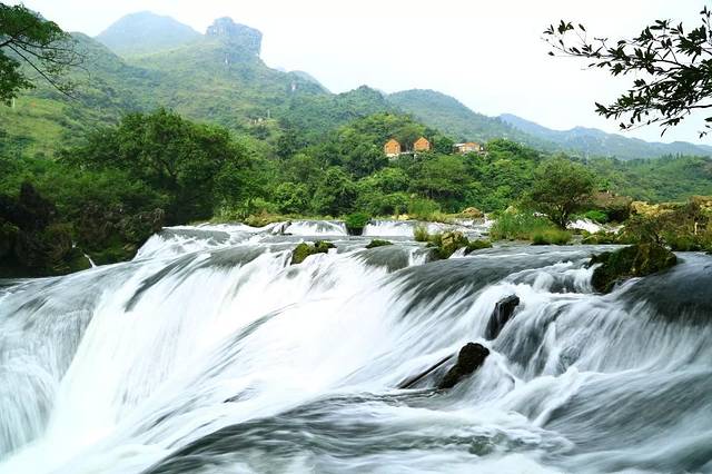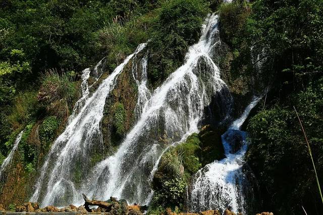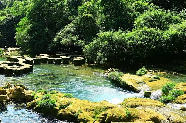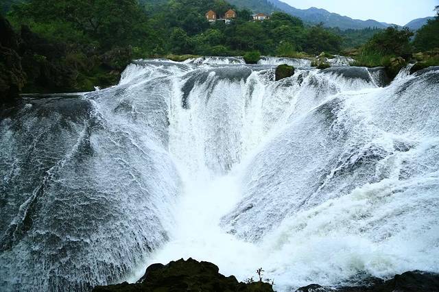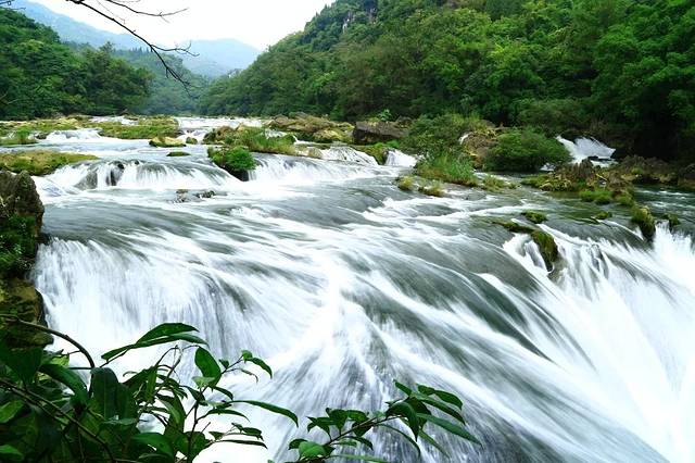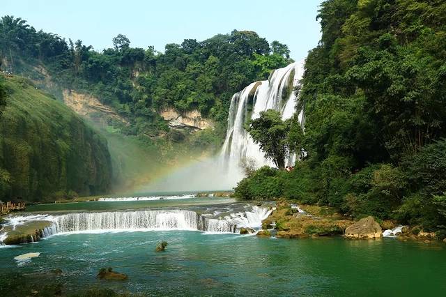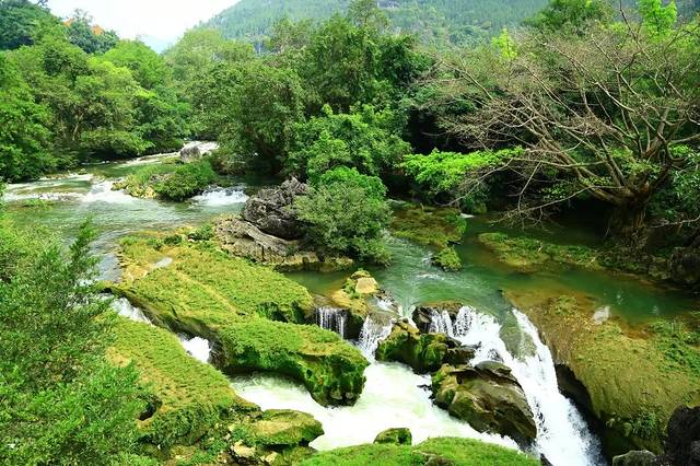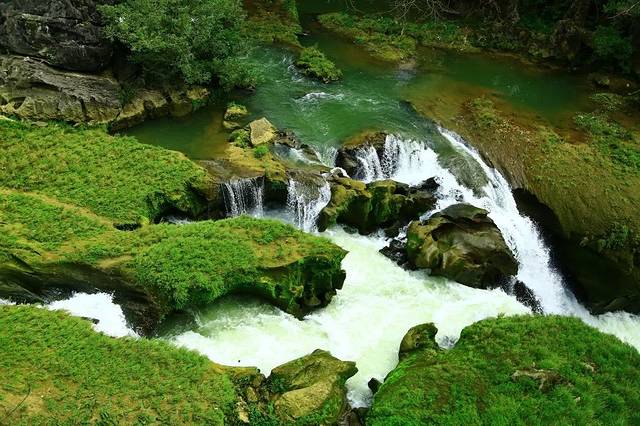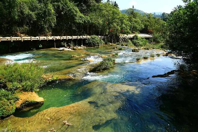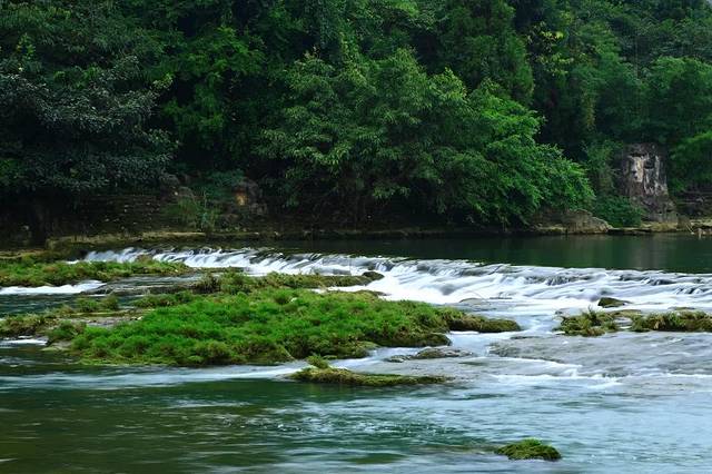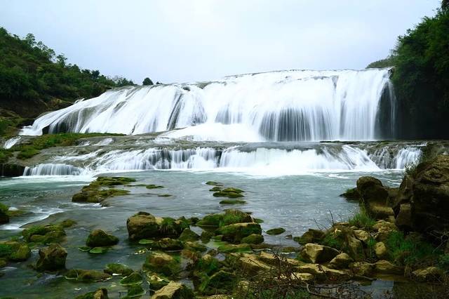 心语他来过两次黄果树瀑布,虽然他有导游证可以免票,但是他已经去过两次了所以在停车场休息,我们先到陡坡塘瀑布景区,这个景区不大,主要景点就是陡坡塘瀑布。陡坡塘瀑布位于黄果树瀑布上游1公里处,瀑顶宽105米,高21米,是黄果树瀑布群中瀑顶最宽的瀑布。陡坡塘瀑布顶上是一个面积达1.5万平方的巨大溶潭,瀑布则是形成在逶迤100多米长的钙化滩坝上。这里基本上半个小时就可以搞定,今天因为是平日所以游客不多,在这里刚好在景区门口碰到广东的旅游团,只能感叹在哪个景区都能碰到广东人,呵呵。