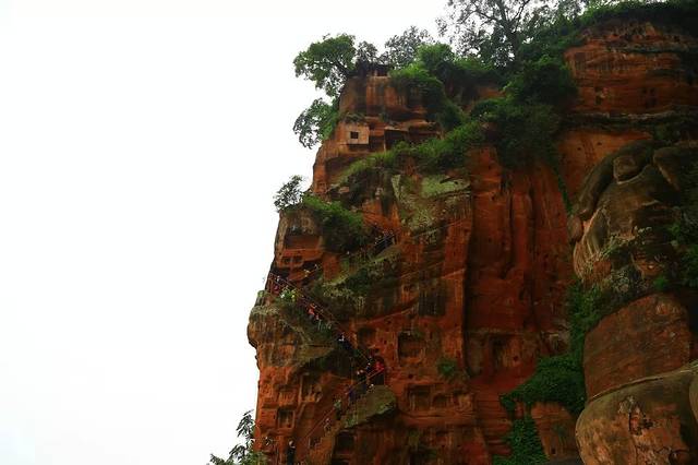 大佛左侧,沿“洞天”下去就是近代开凿的凌云栈道的始端,全长近500米。右侧是唐代开凿大佛时留下的施工和礼佛通道——九曲栈道。因为游客太多沿着狭隘的栈道走下去差不多40分钟才到大佛的脚底, 然后从右边的九曲栈道上山返回大佛头顶,12点这样跟导游集合,然后跟随导游进凌云寺听导游讲解,导游说有需要去峨眉山开光的可以咨询她,我们没有准备这些所以就自己下山去又吃了一回午饭。