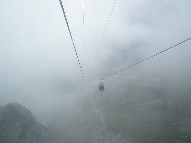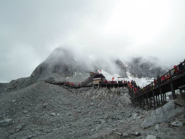 一觉醒来,大大的惊喜,居然是艳阳高照,完全没有了昨天下雨的阴霾。高高兴兴跟团上路奔赴玉龙雪山。首先到达的是露天剧场,张艺谋导演的“印象丽江”,全是少数民族演员,老谋子的风格是人多力量大,像08年奥运开幕式一样,用恢弘的气势震撼人心,整体感觉还是非常不错的。接下来就是乘索道上山了,气温骤降,防寒和防高原反应很重要,导游会统一安排。坐在缆车里往下看,就一个字beautiful,越往上走雾开始多起来。我发现名山大川都有个共同特点,那就是若隐若现犹抱琵琶半遮面,我去过的黄山、长白山都是这样,想见真面目都需要看运气。索道尽头并不是山顶,登顶还有段距离,是勇敢者的游戏,要自己攀登的,海拔已经比较高了,每上一步都会气喘吁吁,不过在氧气瓶的帮助下还是没问题的,特别是年轻人,不需要氧气帮助也很矫健(比如说我,嘿嘿。其实是导游把我的装备忘了,没给我发棉衣和氧气瓶,后来下山才发现。导游后来把氧气瓶的钱退给我了,作为补偿多给了我好多明信片)。努力往上爬,到了第一道红旗的地方海拔4591米,突然有一块山坡云开雾散,赶紧抓住瞬间机会一阵咔嚓。这个季节山上是没有雪的,不过仍然很壮观。很快雾又笼罩了整个山头,本来想继续登顶的,看看集合的时间快到了,再说上去了也都是雾什么都看不到,没什么意思去争那一口气了,下山返回。虽然雪山没有雪,有点小遗憾,但是感觉还是蛮好的,这是我目前为止登上过的最高峰。