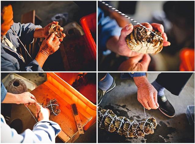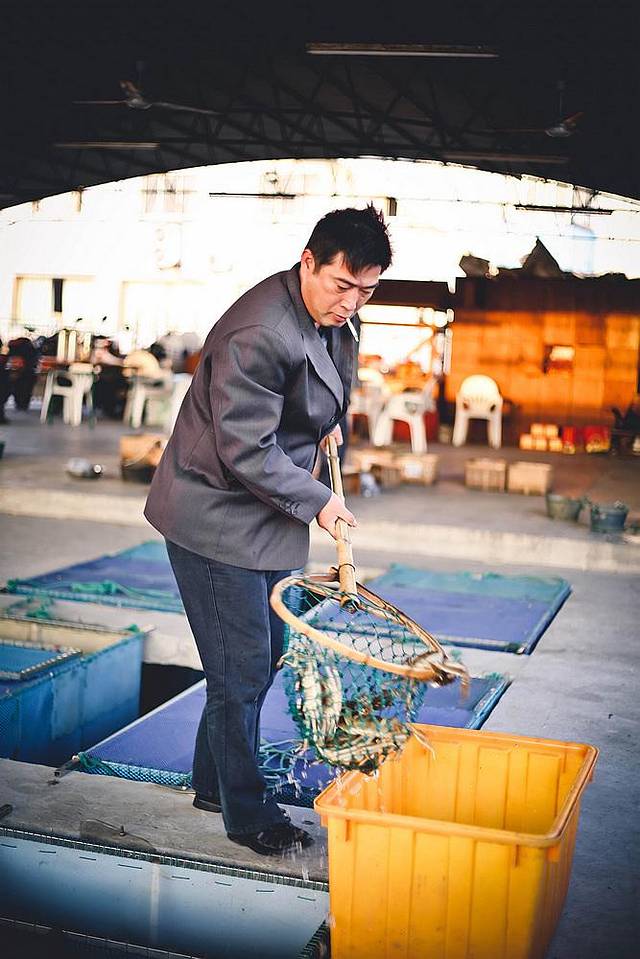 如何捆扎大闸蟹是门技术活,只见这里的杨大叔很熟练地抓起大闸蟹,把它的8条腿并拢歪曲握在掌心,然后把两个大钳子歪曲后用大拇指和小指压住,查看下大闸蟹的肚皮是否干净,如果不干净,就用刷子刷一下,然后再用棉绳一圈一圈把腿和钳子绕起来。