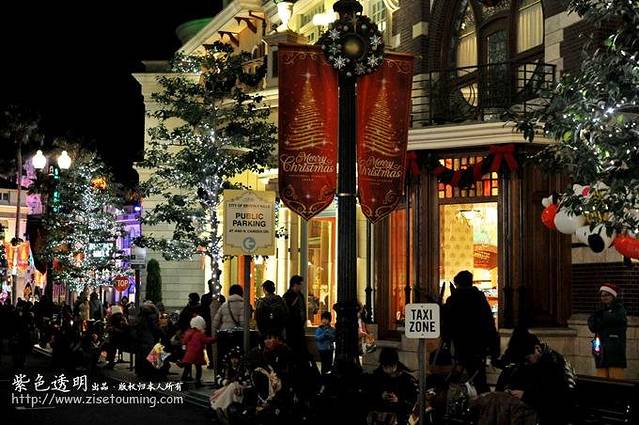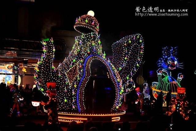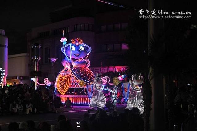 在现场看到的效果比照片中的效果更漂亮,更璀璨。花车周围还有穿上卡通服装的演员们表演歌舞。