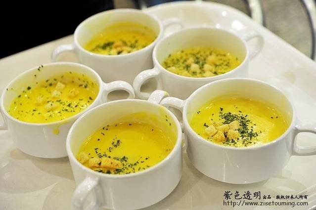 奶油汤,冬天里喝很温暖。上面是面包丁,撒的是干法香碎。