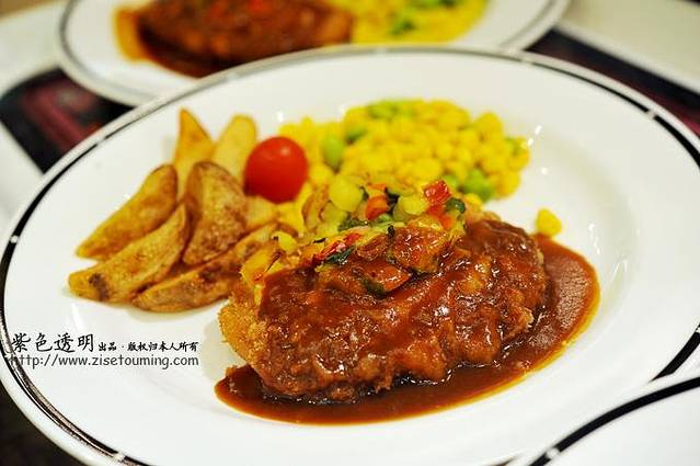 淋酱汁的牛肉饼,配薯角和玉米粒。