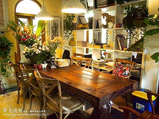 木桌上摆放着各种高矮不同的鲜花,看到心情大好。