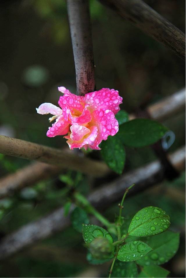 这株月季花更像是一个羞涩的山村少女,倚着栏杆偷偷探头朝我们看着。