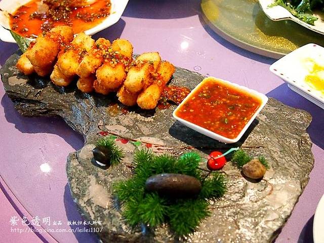 这个开始我以为是炸鲜奶,后来才知道,是兔肉碾成泥,然后裹了脆皮炸的,沾小料吃。