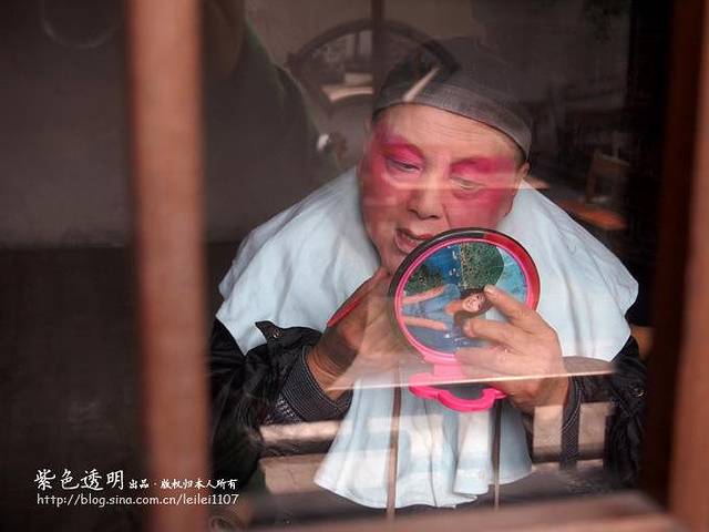 正在化妆,我也不知道这个是老生还是啥生,但这镜子太有笑点了。