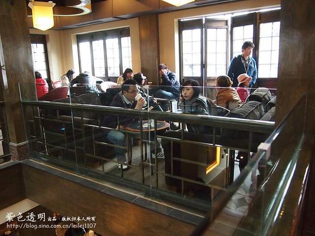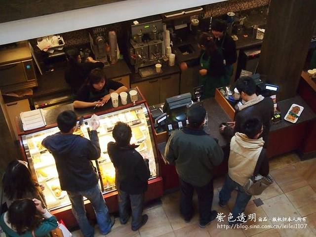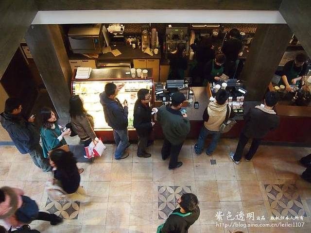 这家星巴克有3层,我们是周末去的,人很多。售卖只在一楼,如果你到三层去找位子,那么还是要到一层来点单的。这张照片是站在二层拍的。