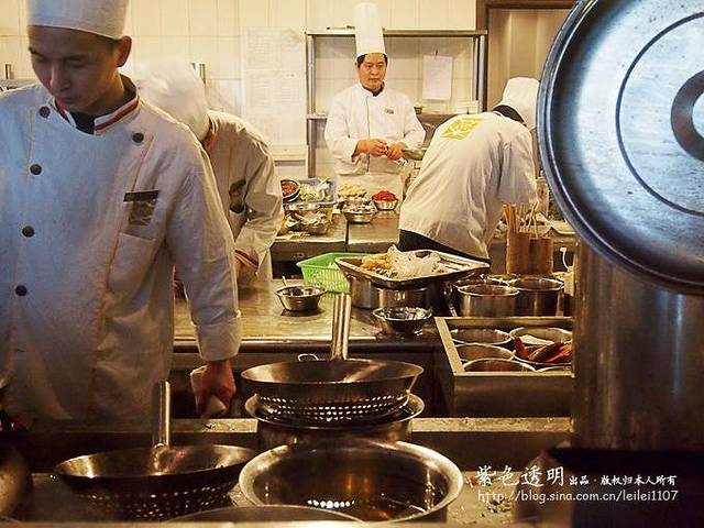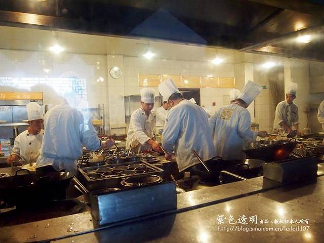 隔着玻璃拍的,第一排是掌勺的大厨,后面是负责配菜,装饰摆盘的。
