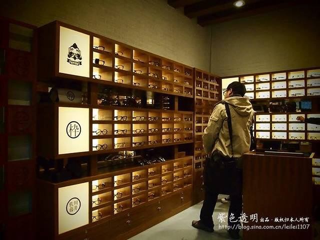 这是一家眼镜店,全木质的格子,每个各自摆一幅镜架。