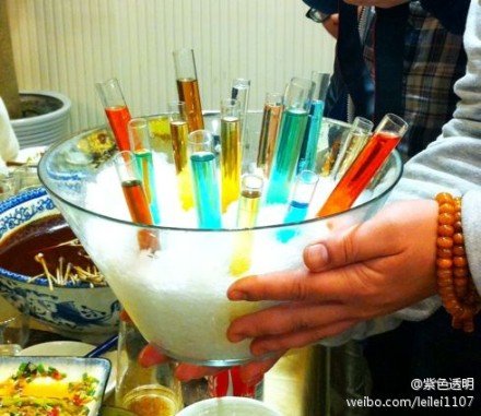 在签签会玩了个小刺激的游戏,这个盆里插着各种饮品,有伏特加,有威士忌,有雪碧,还有白酒等等。猜拳后输者要任选一种直接喝下,不能闻并且一饮而尽。完后还可以假装一下,来蒙蔽大家。有幸运嘉宾直饮了高度数白酒哇。