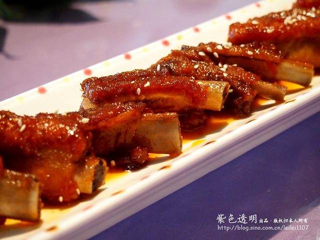 排骨,是油炸过的,味道甜口,很好吃。但对于糖醋排骨这类的,我总觉得排骨的口感有点干。