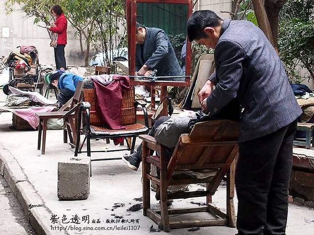 在居民区里有刮胡子理发的,各种家伙事还不少。椅子还是这种仰式的躺椅,还有大镜子,也太舒服享受了。在北京也就是一个无靠背的凳子,再来一个手持小镜子。