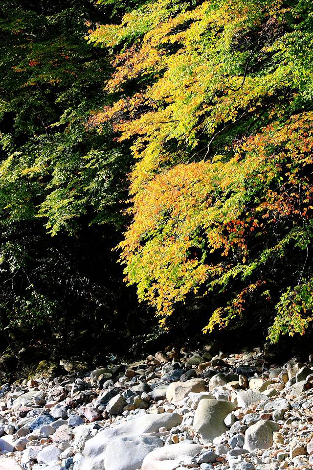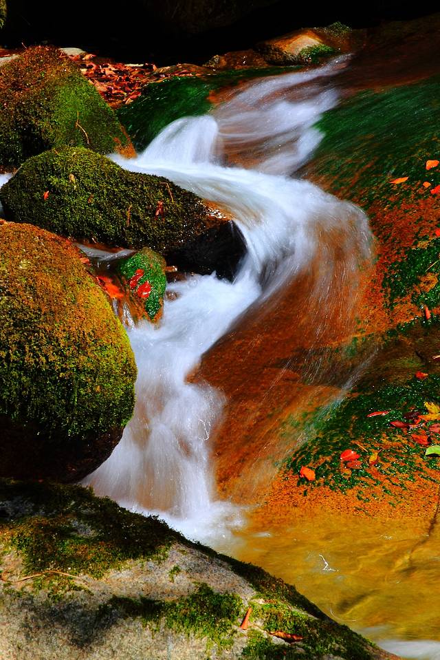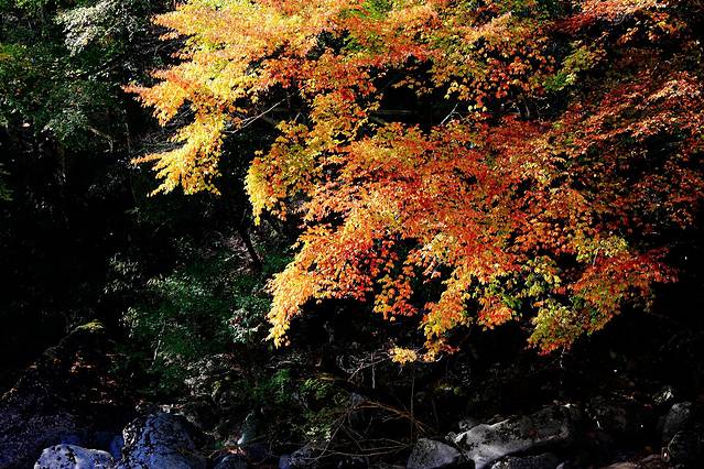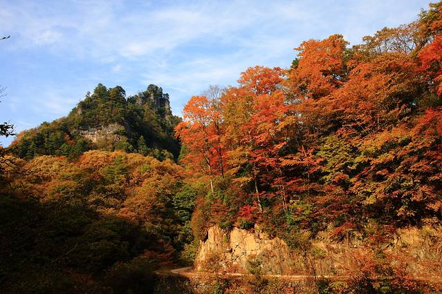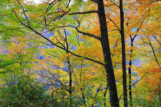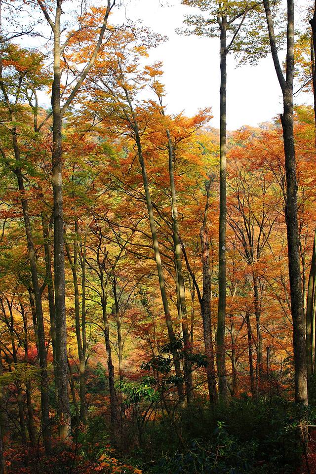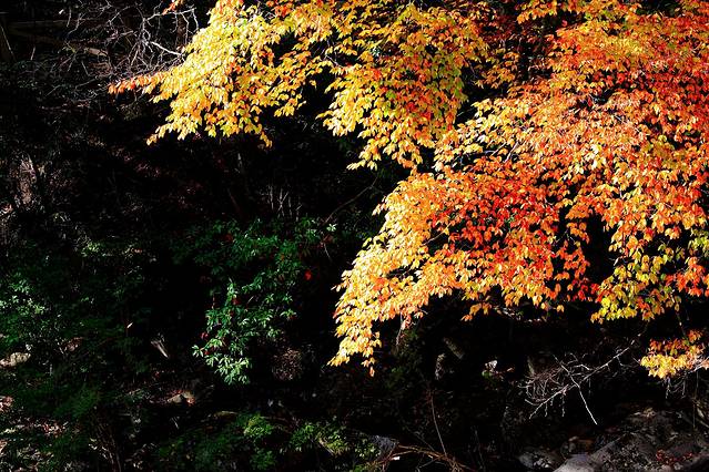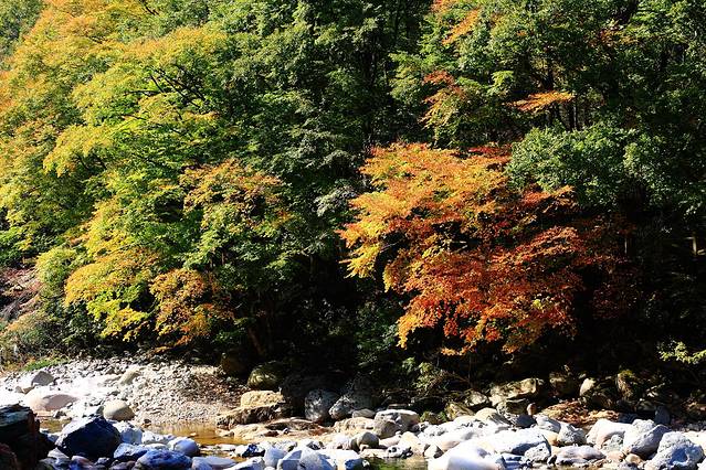 不得不说的是,在去光雾山之前,有关十八月潭的介绍很少,多数都是一笔带过。但此次的光雾山之行,风光最美、秋色最重、最有震撼力的当属十八月潭(不过,据说十八月潭的秋天来的最早)。从大坝景区的大门到十八月潭约70km,其中包括从十八月潭大门到十八月潭的39km的单行盘山路(这段路很险,只能过一辆车,时速基本上是20-35km)。从进入十八月潭之后,越往里走,映入眼睑的风景越具震撼力,路上的风光很美,但停车不方便。拍照时一定要将车停在路稍宽的地方,给别的车留下通道,此外停留时间也不要过长,拍完照片立即走人,总之,与人方便与己方便。